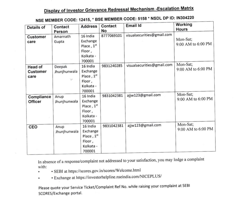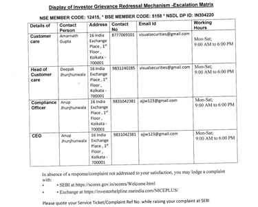 For any complaints pertaining to securities broking please write to Visual_securities@yahoo.co.in,