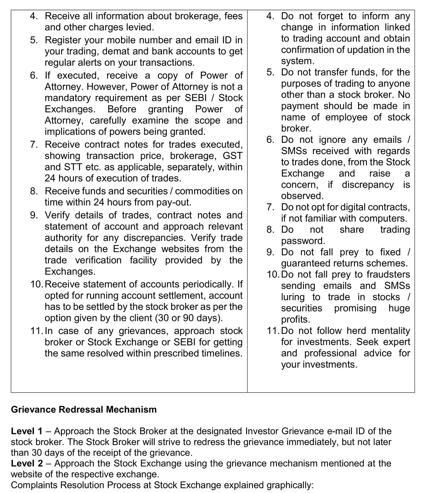 Level 1– Approach the Stock Broker at the designated Investor Grievance e-mail ID of the stock broker. The Stock Broker will strive to redress the grievance immediately, but not later than 30 days of the receipt of the grievance.